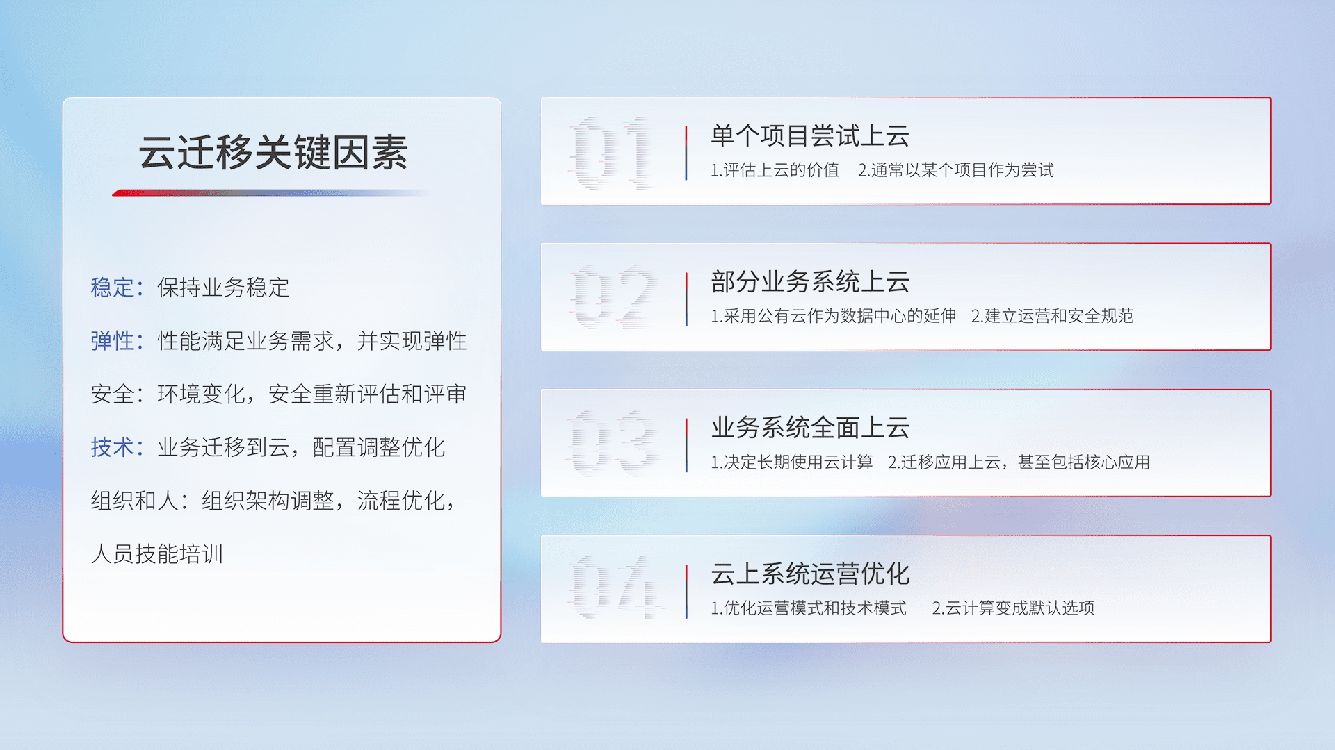 结合实际业务,,从规划设计、、云平台选型、、、云原生改造、、、、数据迁移、、、集成交付,,,,迁移全过程为客户识别最佳上云路径,,,,做好风险识别管理,,,,设计网络架构、、身份权限、、安全审计合规、、操作审计、、日志审计、、监控告警策略、、、多站点容灾设计等,,,,对云上基础设施进行整体规划,,,,提升IT治理水平,,以满足弹性、、、高可用、、高性能的需求。。