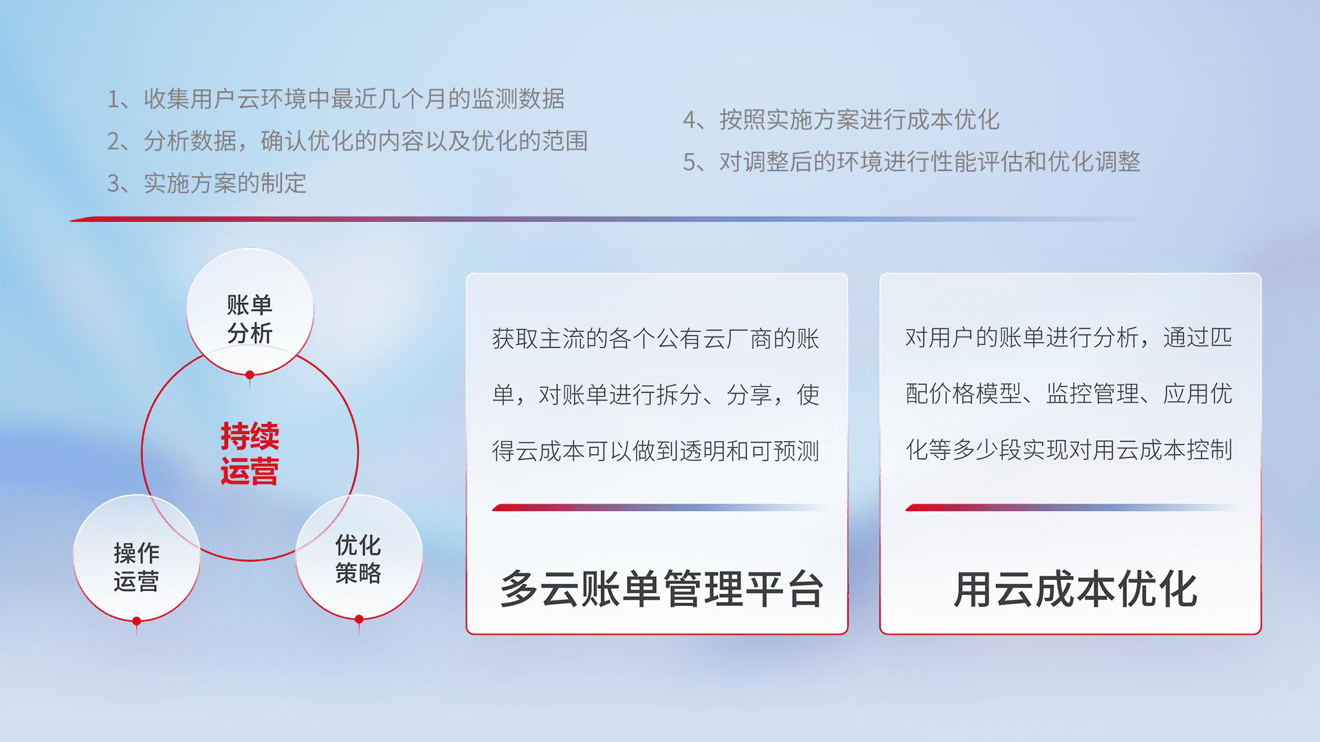 通过多云纳管,,,,以统一的资源数据模型把客户的云资源进行抽象和封装,,,进而实现对多云资源的统一操作,,保障云资源管理的可靠性、、、、稳定性与可用性。。。量身定制化运维内容,,,配置、、、开发运维、、补丁管理、、备份、、监控、、、认证和访问管理、、、、审计和日常巡检等,,,,保障在用云过程中的可靠度,,,,稳定度以及高可用率。。。